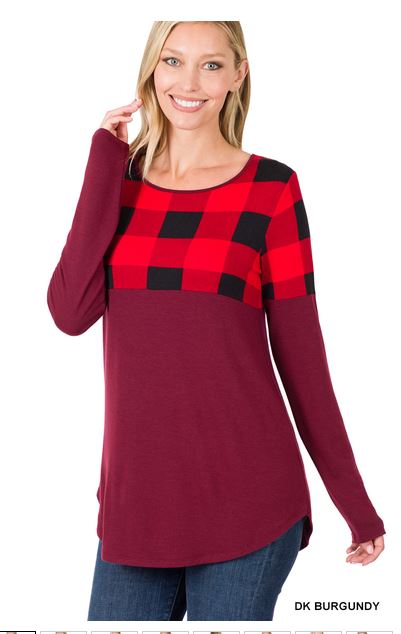 Burgundy Plaid Color Block LS Top