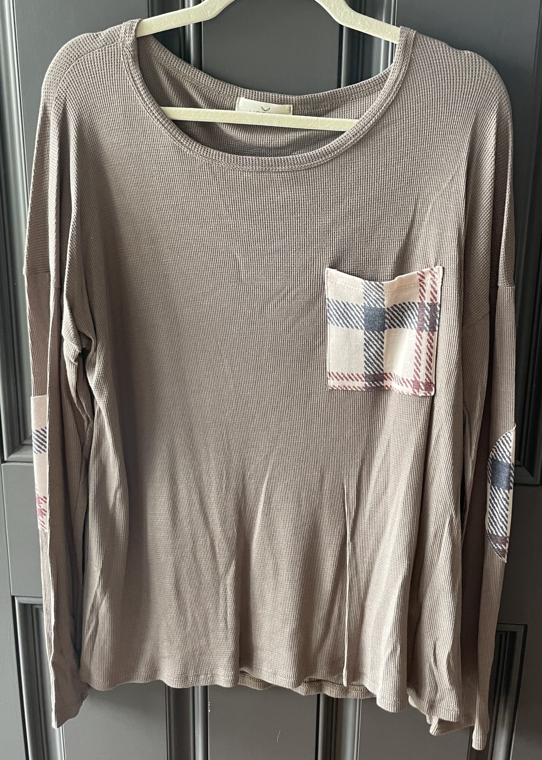 Taupe Top with Plaid Pocket and Elbow Pad